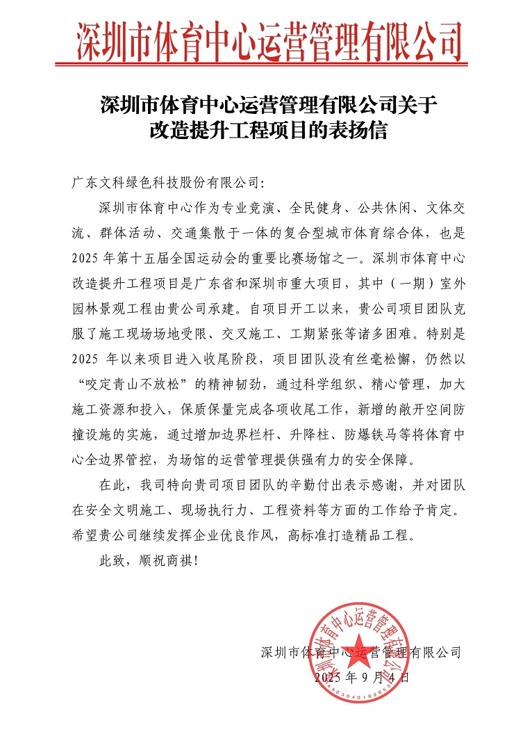 秋日胜春朝,奋进正当时。近日,公司收到来自深圳市体育中心运营管理有限公司的表扬信,信中对文科股份承建的深圳市体育中心改造提升工程(一期)室外园林景观项目给予高度评价,充分肯定了项目团队在攻坚克难、安全施工、现场执行力、质量管控等方面的卓越表现,为2025年第十五届全国运动会重要比赛场馆的顺利建设注入强劲动力。