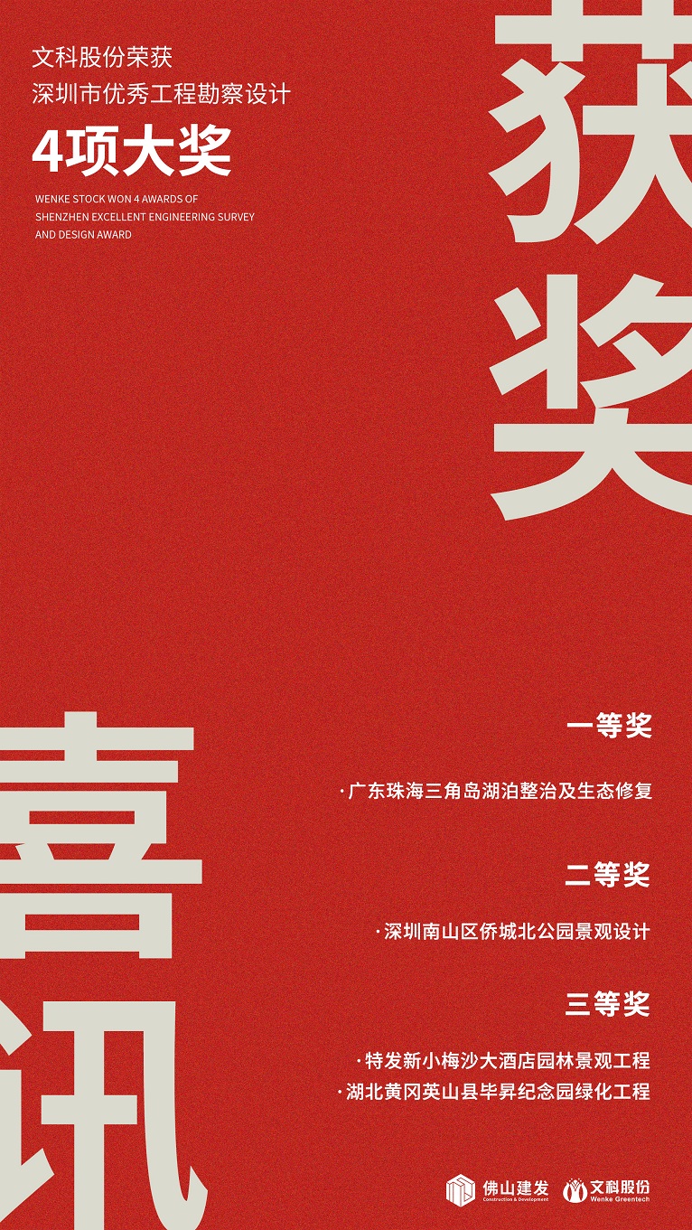 近日,深圳市勘察设计行业协会公布第二十一届深圳市优秀工程勘察设计奖评选结果,文科股份荣获4项大奖。获奖项目有“广东珠海三角岛湖泊整治及生态修复”一等奖、“深圳南山区侨城北公园景观设计”二等奖、“特发新小梅沙大酒店园林景观工程”三等奖、“湖北黄冈英山县毕昇纪念园绿化工程”三等奖,恭喜项目设计团队!